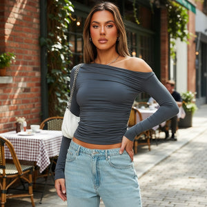 Women'S Spring Ins New Solid Color Slanted Shoulder Long Sleeve Pleated Crop Top T-Shirt Women'S