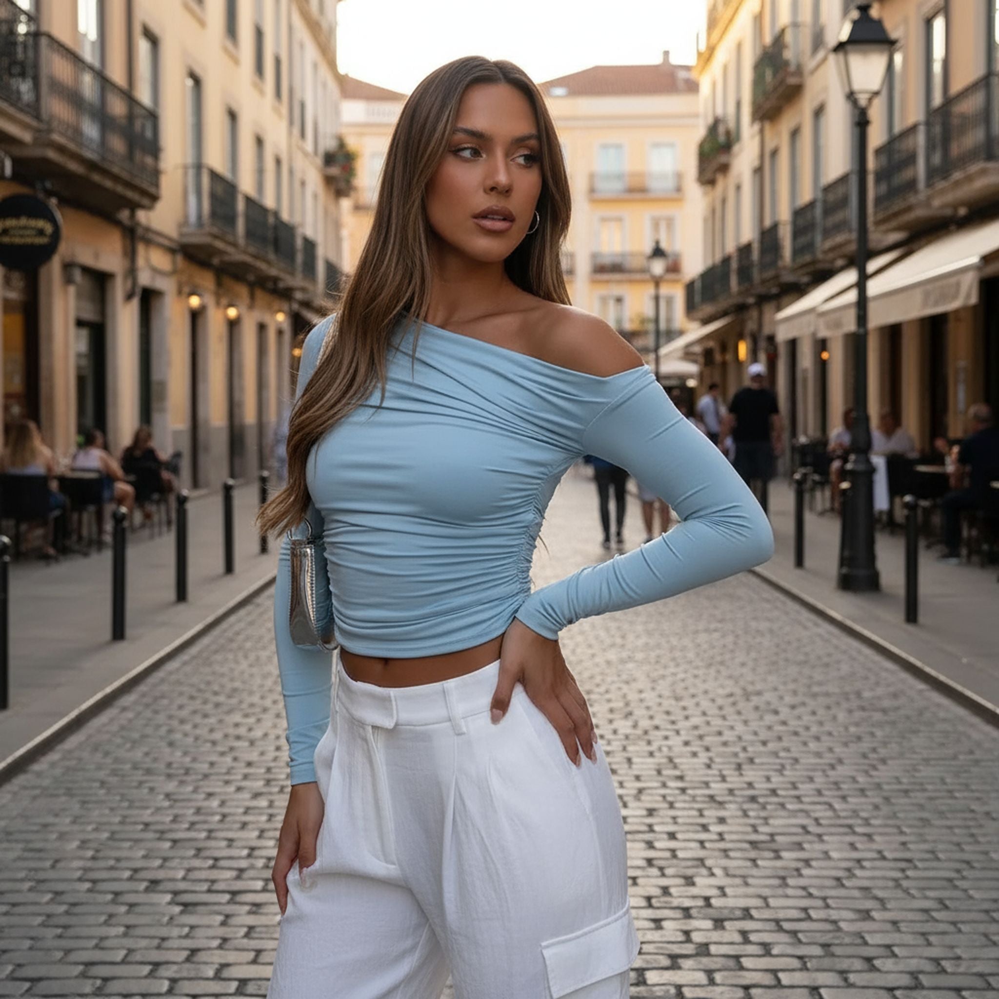 Women'S Spring Ins New Solid Color Slanted Shoulder Long Sleeve Pleated Crop Top T-Shirt Women'S