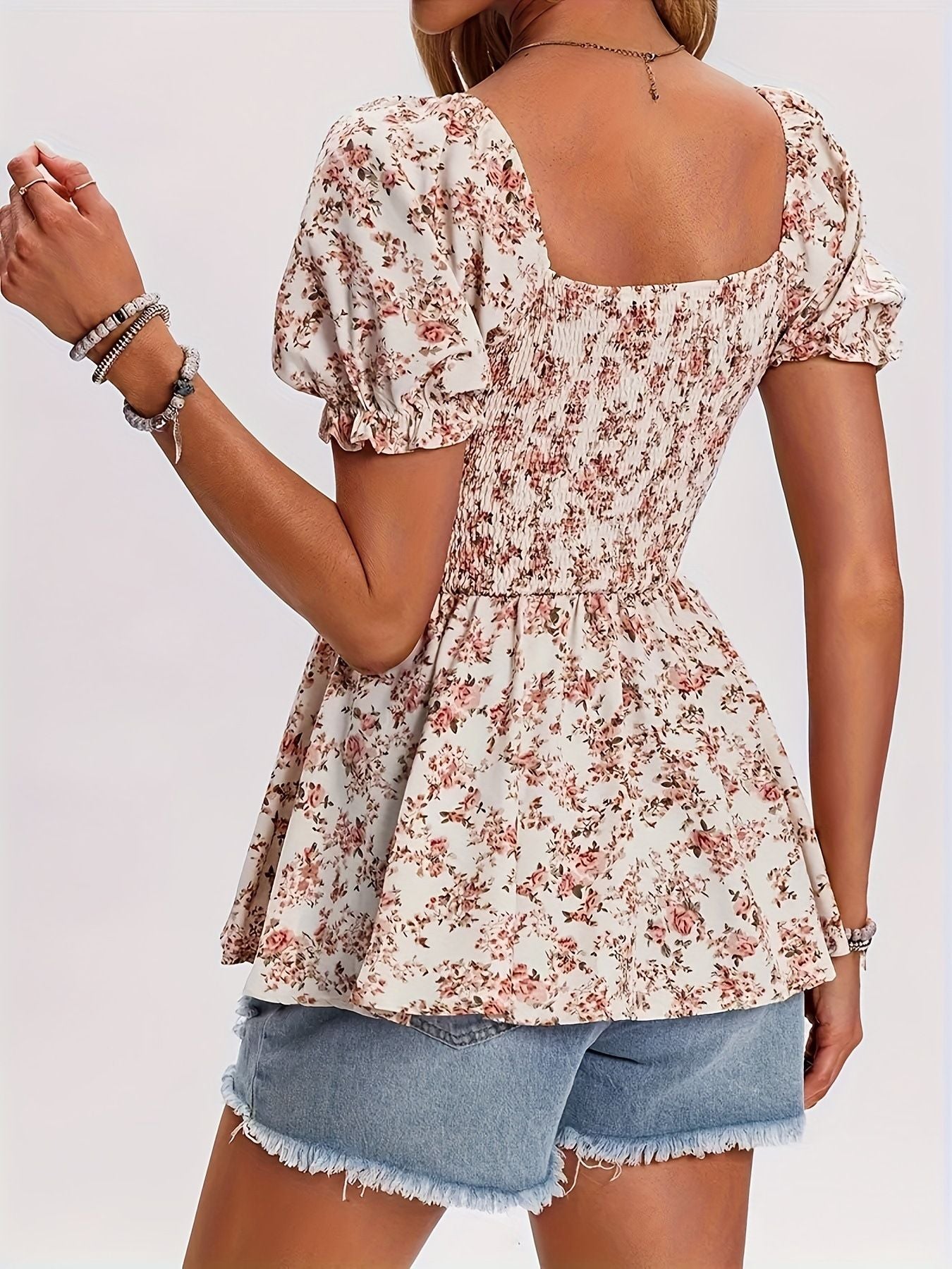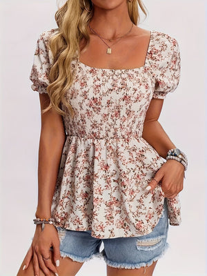 Casual Square Neck With Ruffle Sleeves Floral Holiday Top