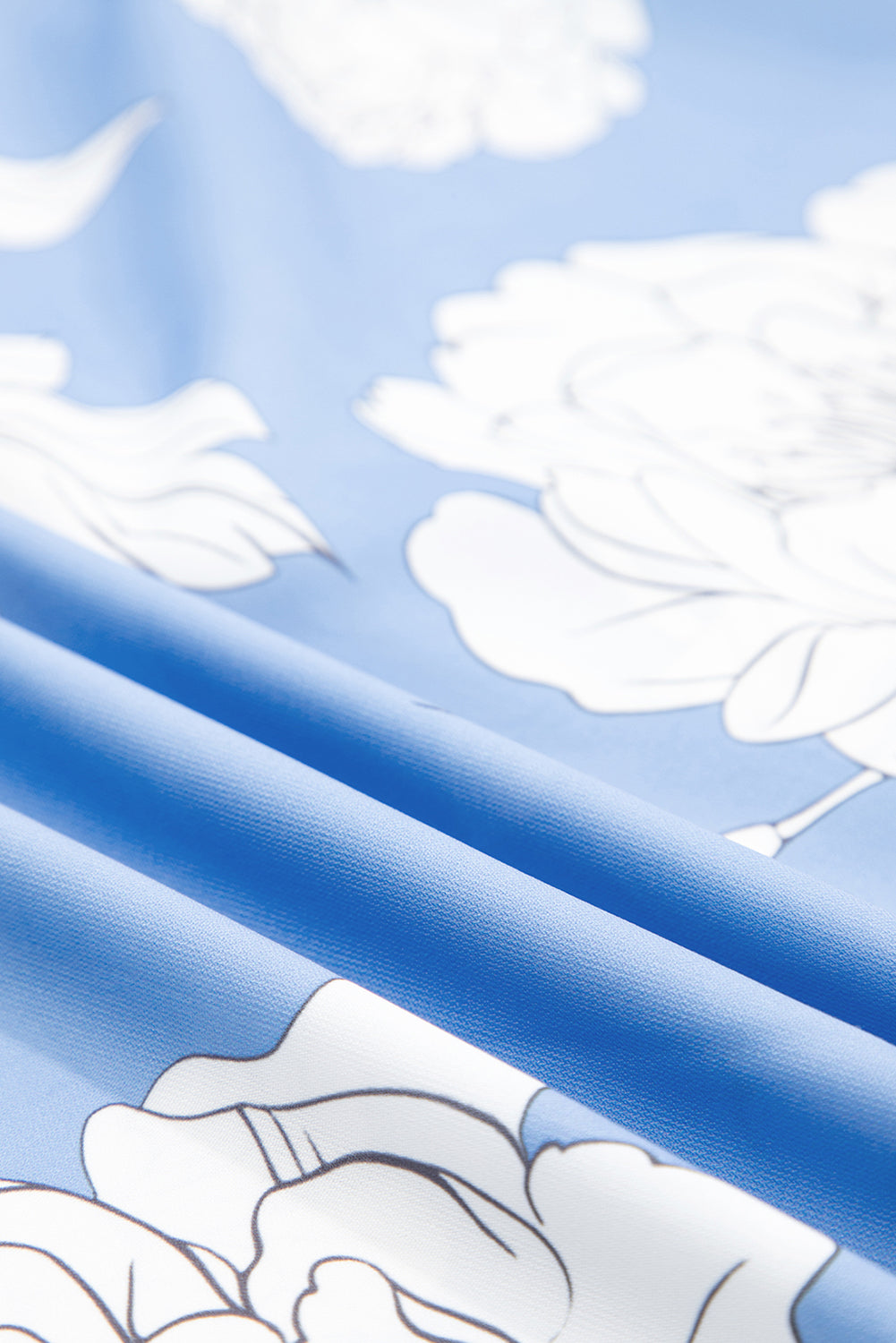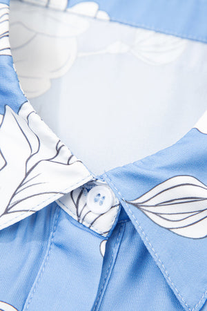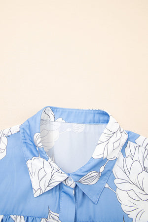 Sky Blue Floral Print Button Up Pleated Detail Puff Sleeve Shirt