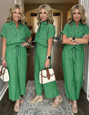 Striped Suit Lapel Short-Sleeved Straight-Leg Lazy Style Trousers