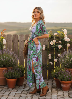 Autumn New Fashion V-Neck Loose Boho Print Slit Dress