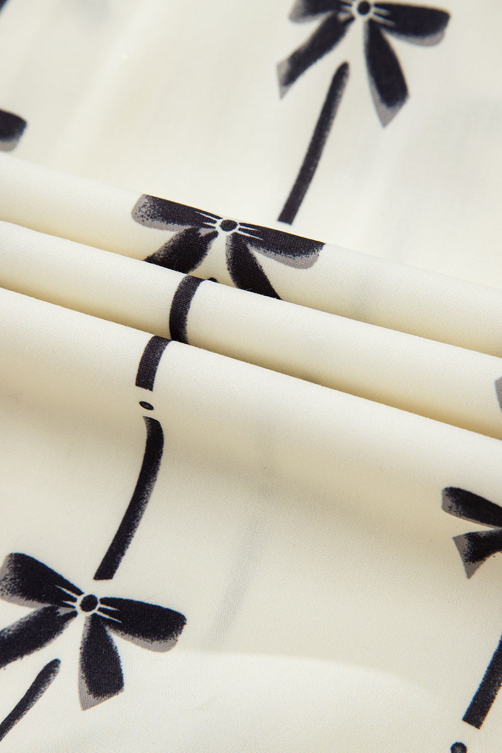 Beige Cute Bowknot Printed Bubble Sleeve V Neck Mini Dress