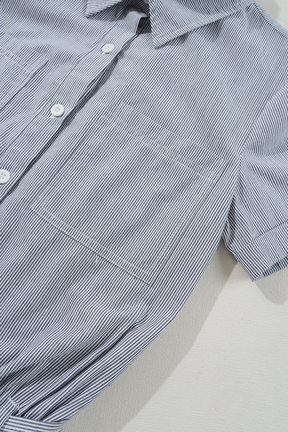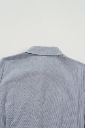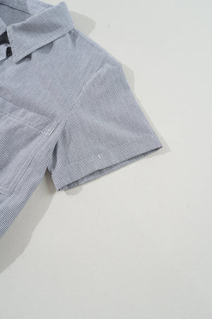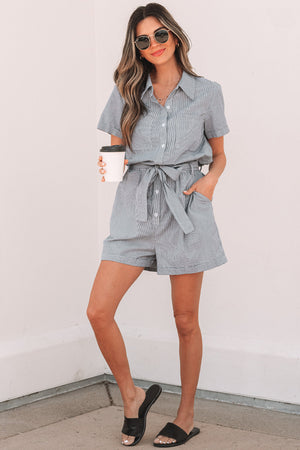 Blue Stripe Chest Pockets Buttoned Belted High Waist Romper