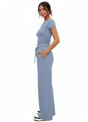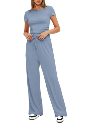 Casual Suit Ruffled Short Sleeve Top High Waist Wide-Leg Pants Sportswear