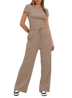 Casual Suit Ruffled Short Sleeve Top High Waist Wide-Leg Pants Sportswear
