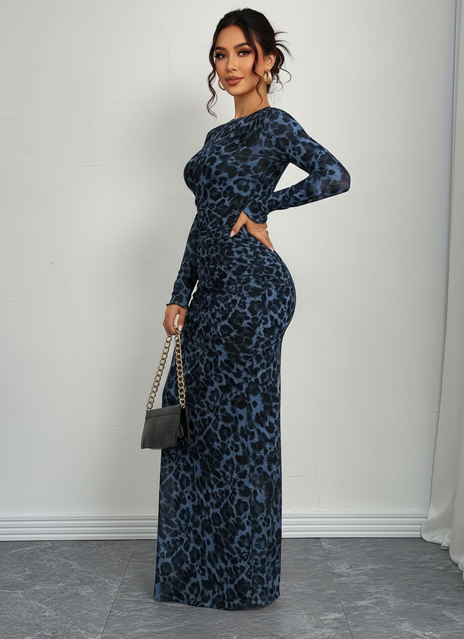 Elegant Leopard Print Slim Sheer Long Sleeve European American Sexy Waist Skinny Dress Women'S Blue
