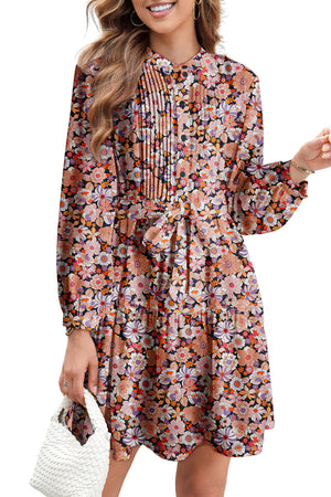 Multicolour Floral Print Long Sleeve Pleated Detail Bleted Mini Dress