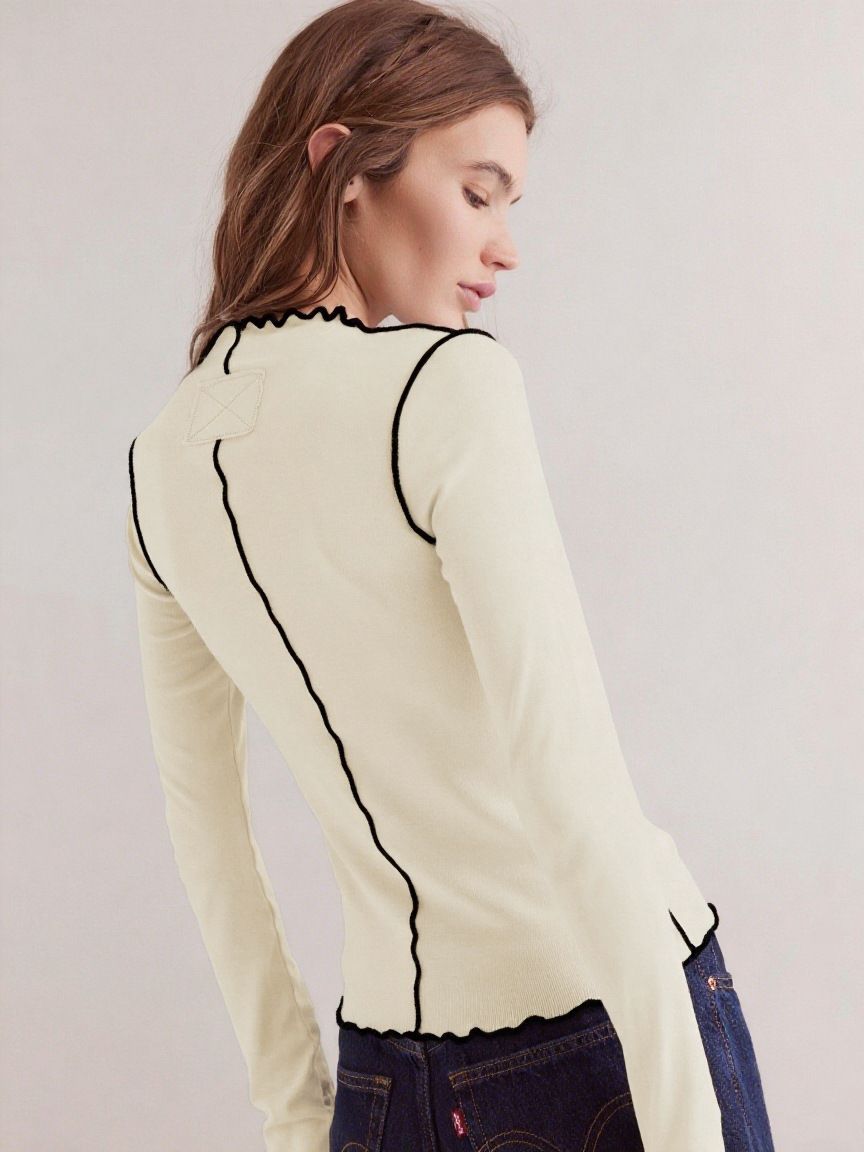 Home New Contrasting Rolled Edge Semi-Turtleneck Long-Sleeved T-Shirt