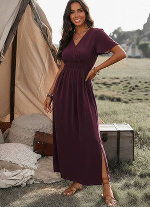 Home New Solid Color V-Neck Flared Sleeves Elasticated Waist Slimming Slit Long Skirt