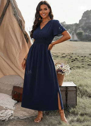 New Solid Color V-Neck Flared Sleeves Elasticated Waist Slimming Slit Long Skirt