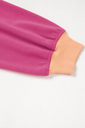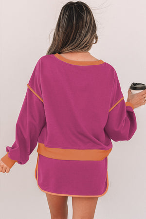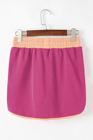 Rose Red Color Contrast Loose Pullover and Lace-up Waist Skort Set