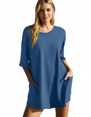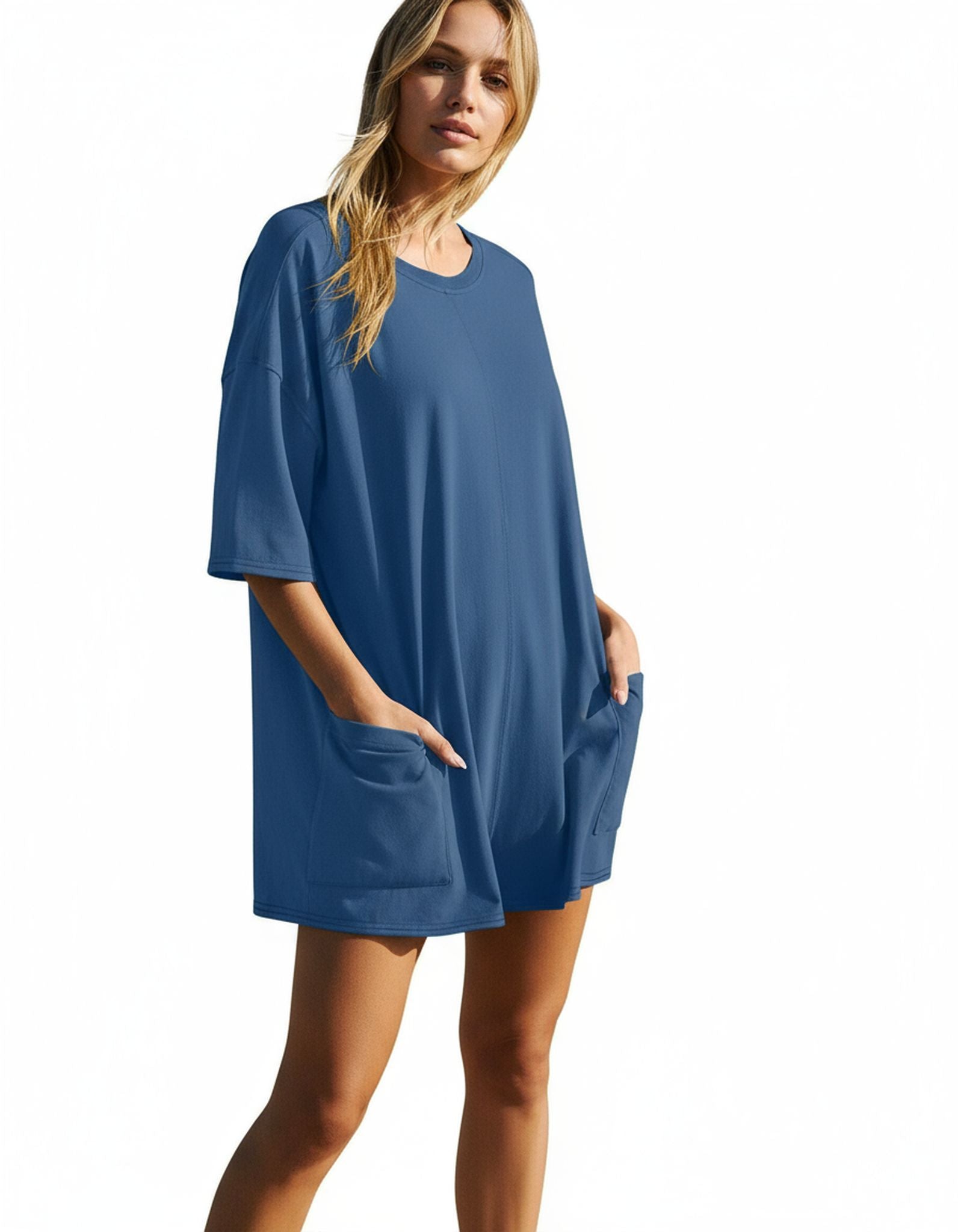 Home Short Sleeve Open Back V-Neck Loose Casual Pocket Jumpsuit