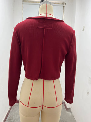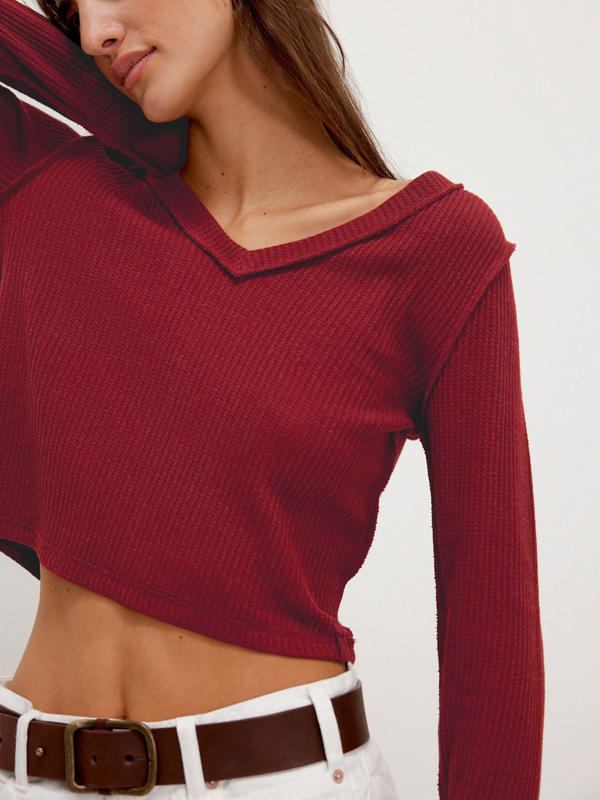 Solid Color Slim Front Shoulder Long Sleeve Small Waffle V-Neck Fashion Versatile Top