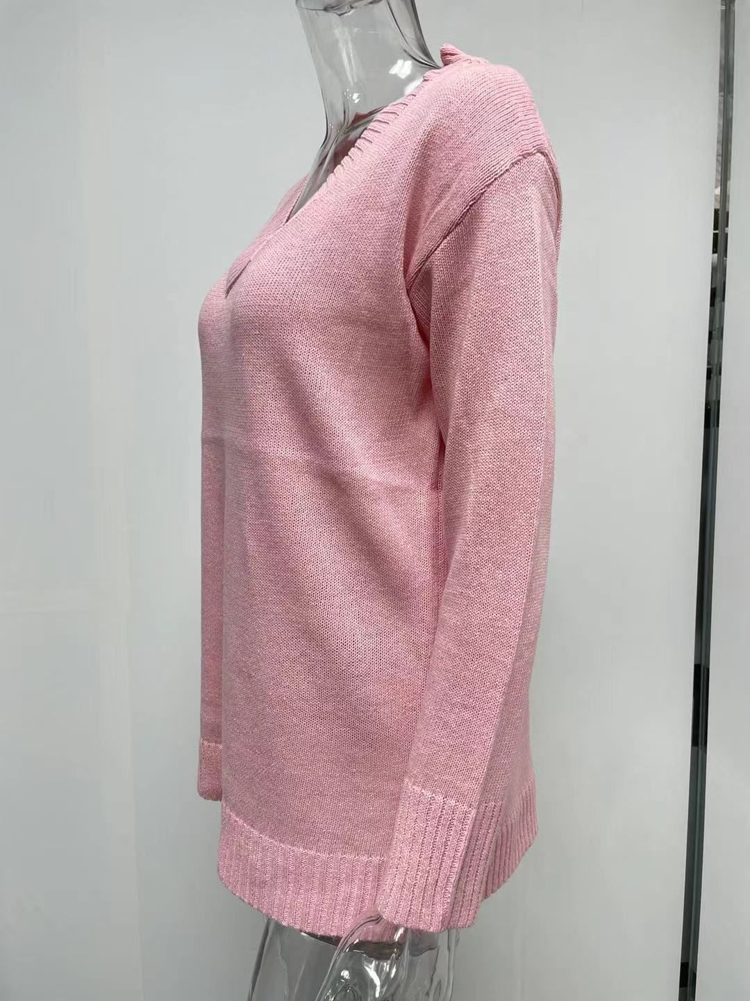 Solid Color Sweater Women'S V-Neck Long Sleeve Pullover Knitted Top